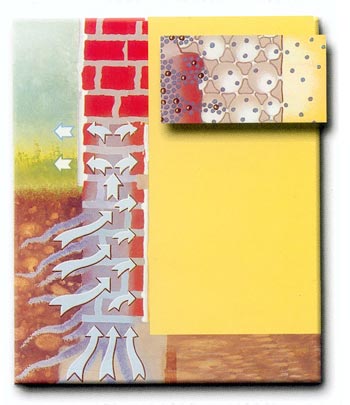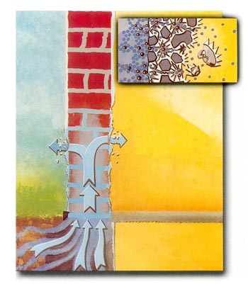 Essi permettono all'umidità che risale il muro di uscire sottoforma di vapore. I sali che distruggerebbero l'intonaco non passano e non potendosi sciogliere nel vapore rimangono nella muratura sottoforma soluta. Come negli intonaci classici di risanamento, l'umidità passa attraverso lo strato di intonaco all'esterno. Ma la differenza sta nel dettaglio: i pori di DEUCEM sono collegati tra loro da capillari finissimi. Essi permettono all'umidità di risalire il muro e di uscire sotto forma di vapore, mentre i sali che distruggono l'intonaco non passano: rimangono chiusi nella muratura in forma soluta evitando di formare quei cristalli che provocano i danni, perciò non viene neanche bloccato il processo di diffusione evitando che l'umidità risalga ulteriormente nel muro e l'intonaco DEUCEM rimane sempre intatto ed asciutto.
